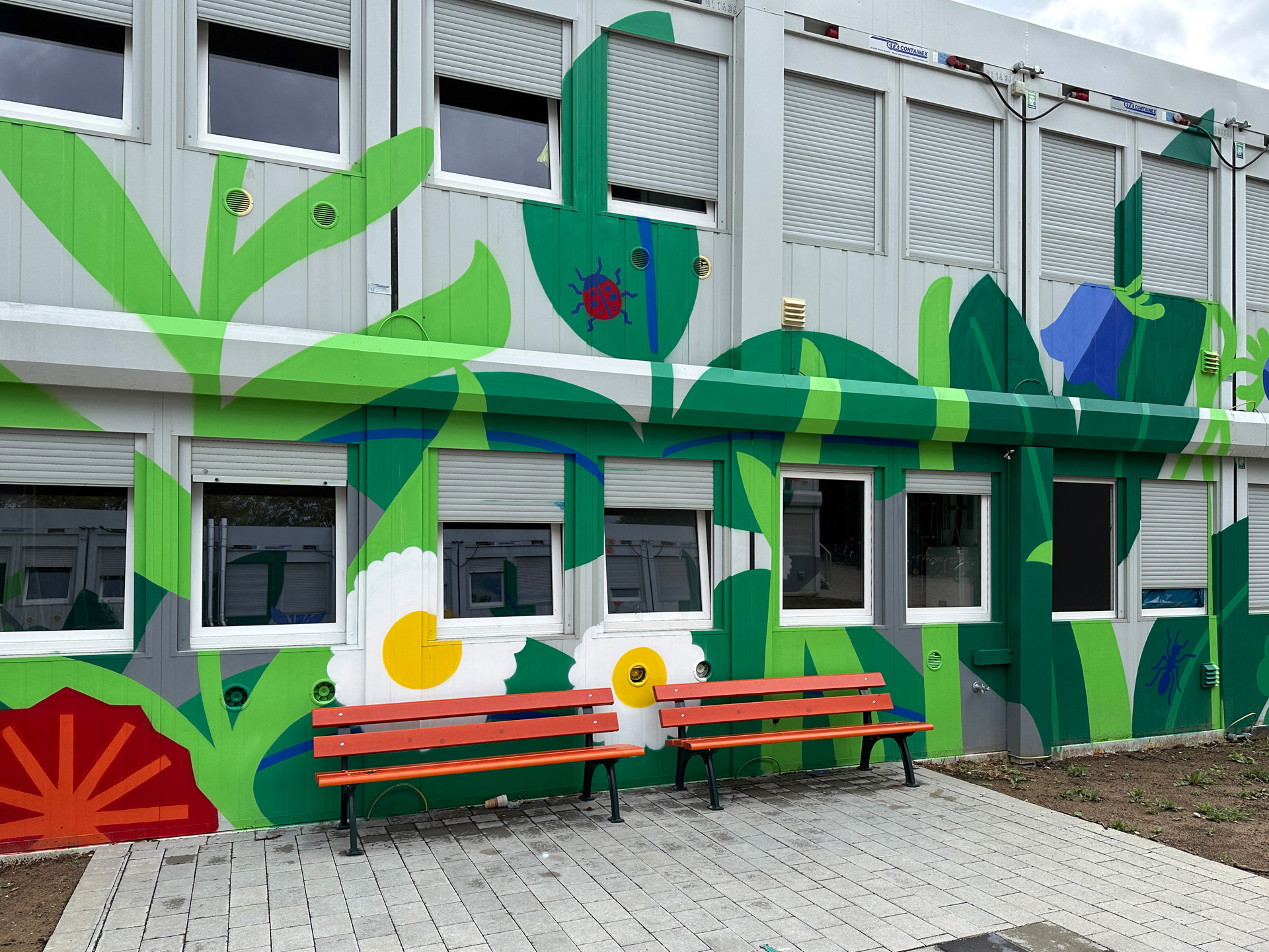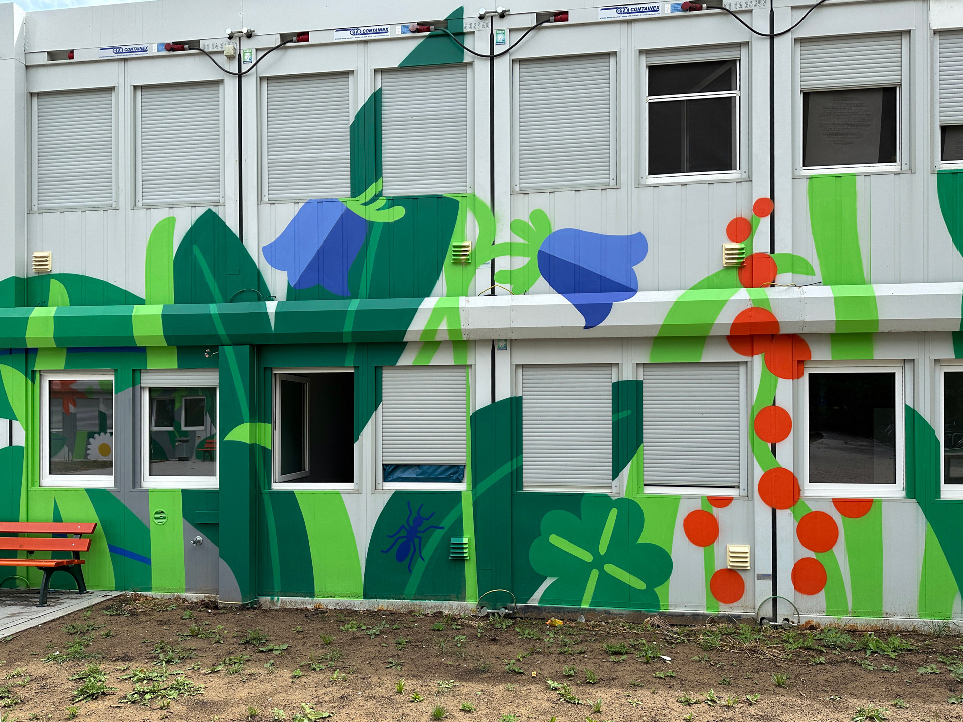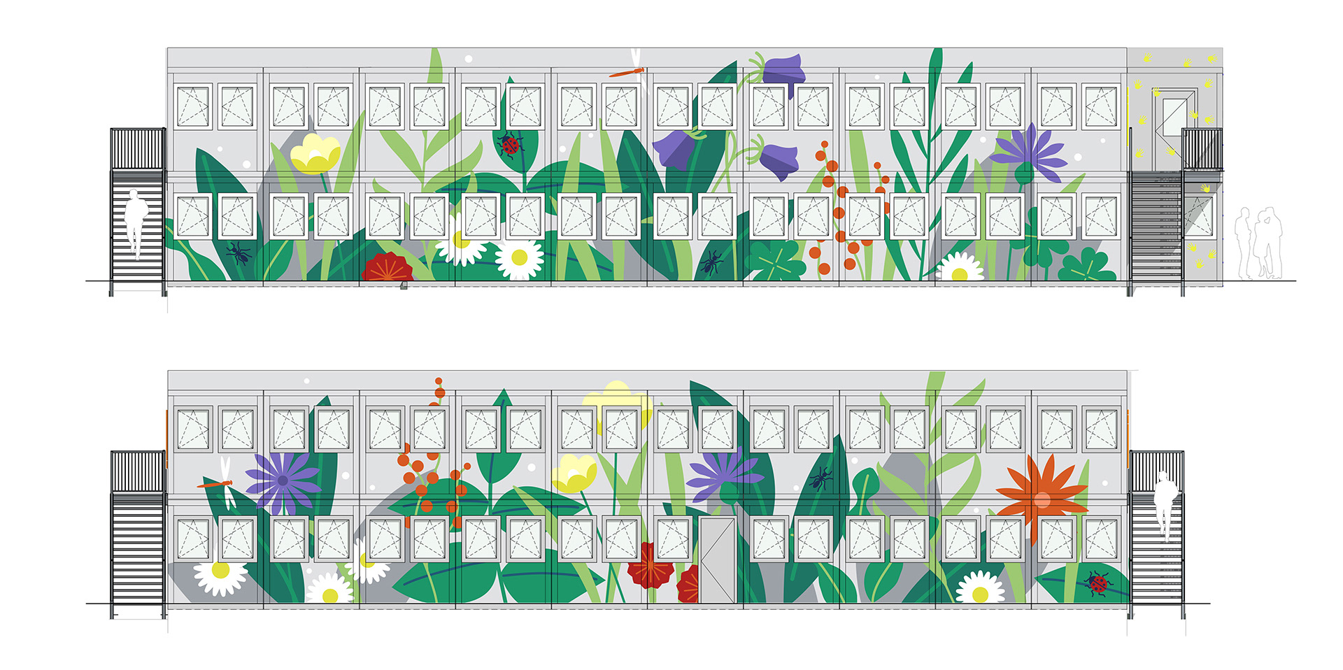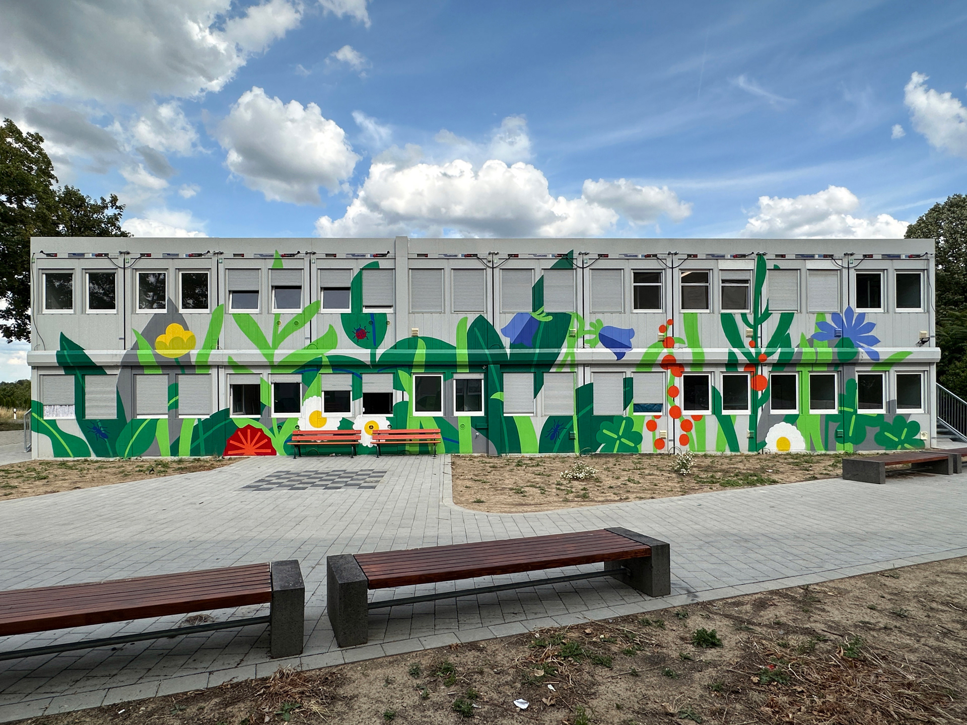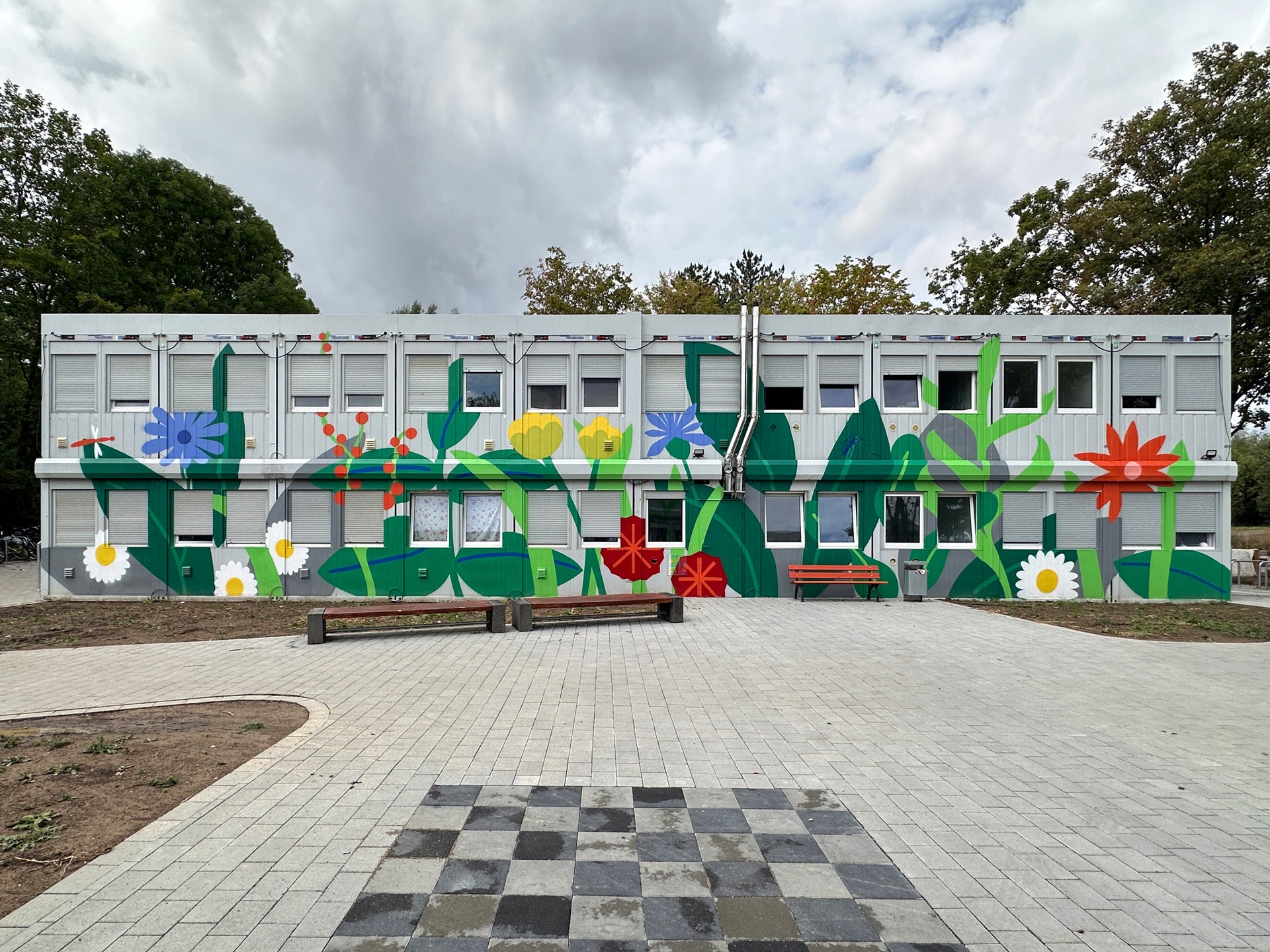 Die florale Wandgestaltung soll den Bereich zwischen den Gebäuden des Wohnheims für Geflüchtete in Fellbach bei Stuttgart einladender gestalten und dazu beitragen einen Ort zu schaffen, an dem sich die Bewohner treffen und gemeinsam gärtnern können.