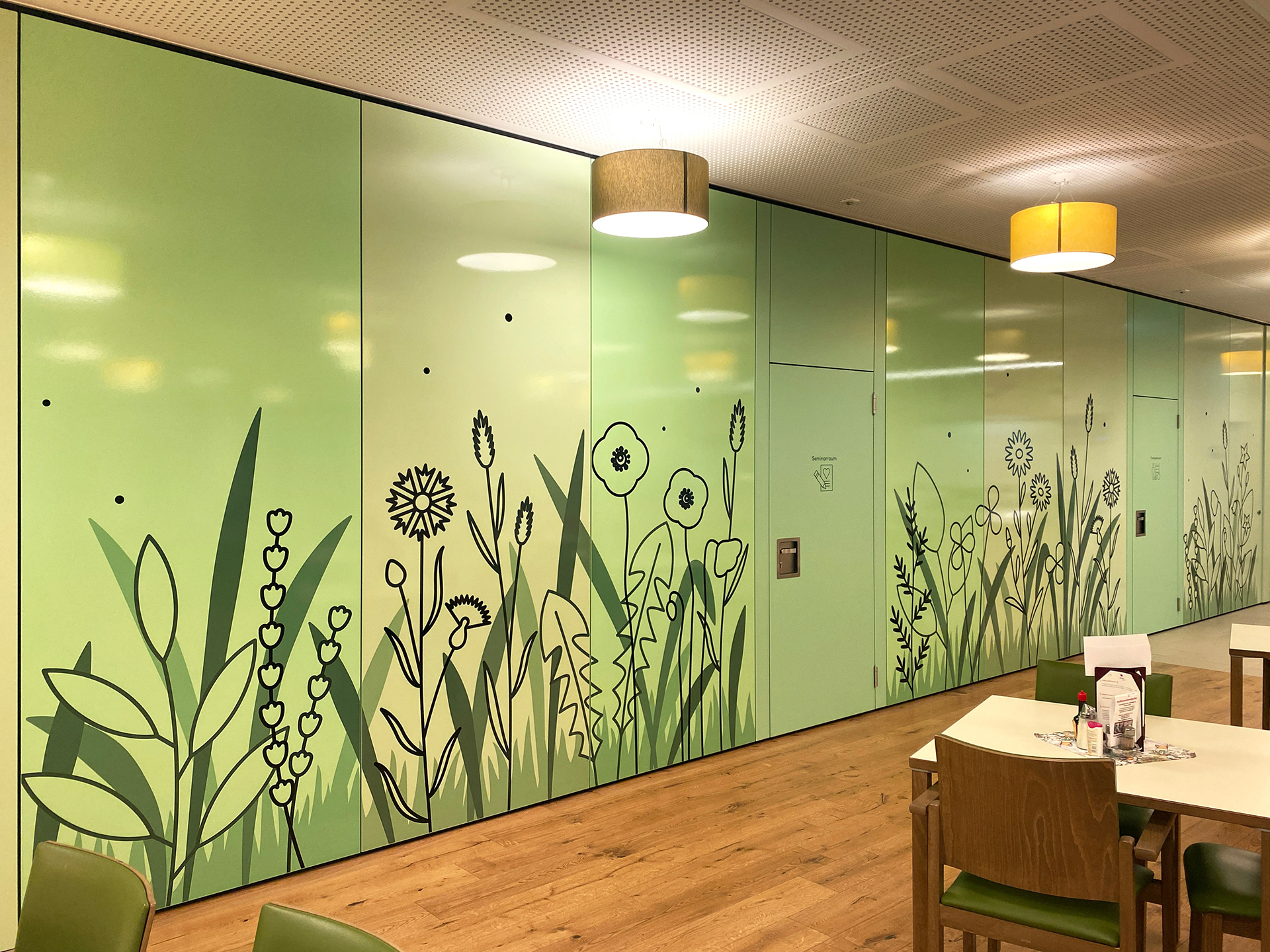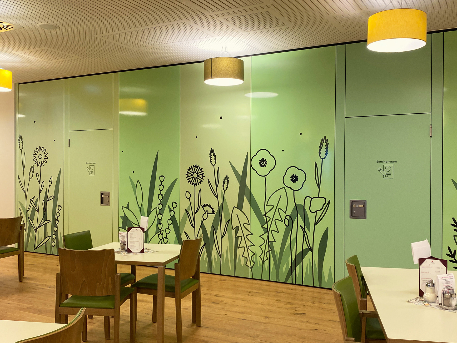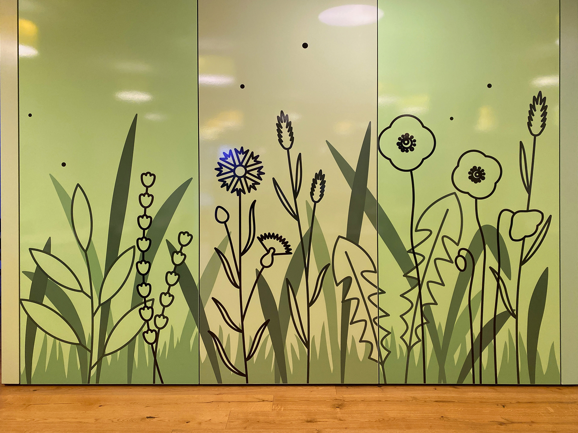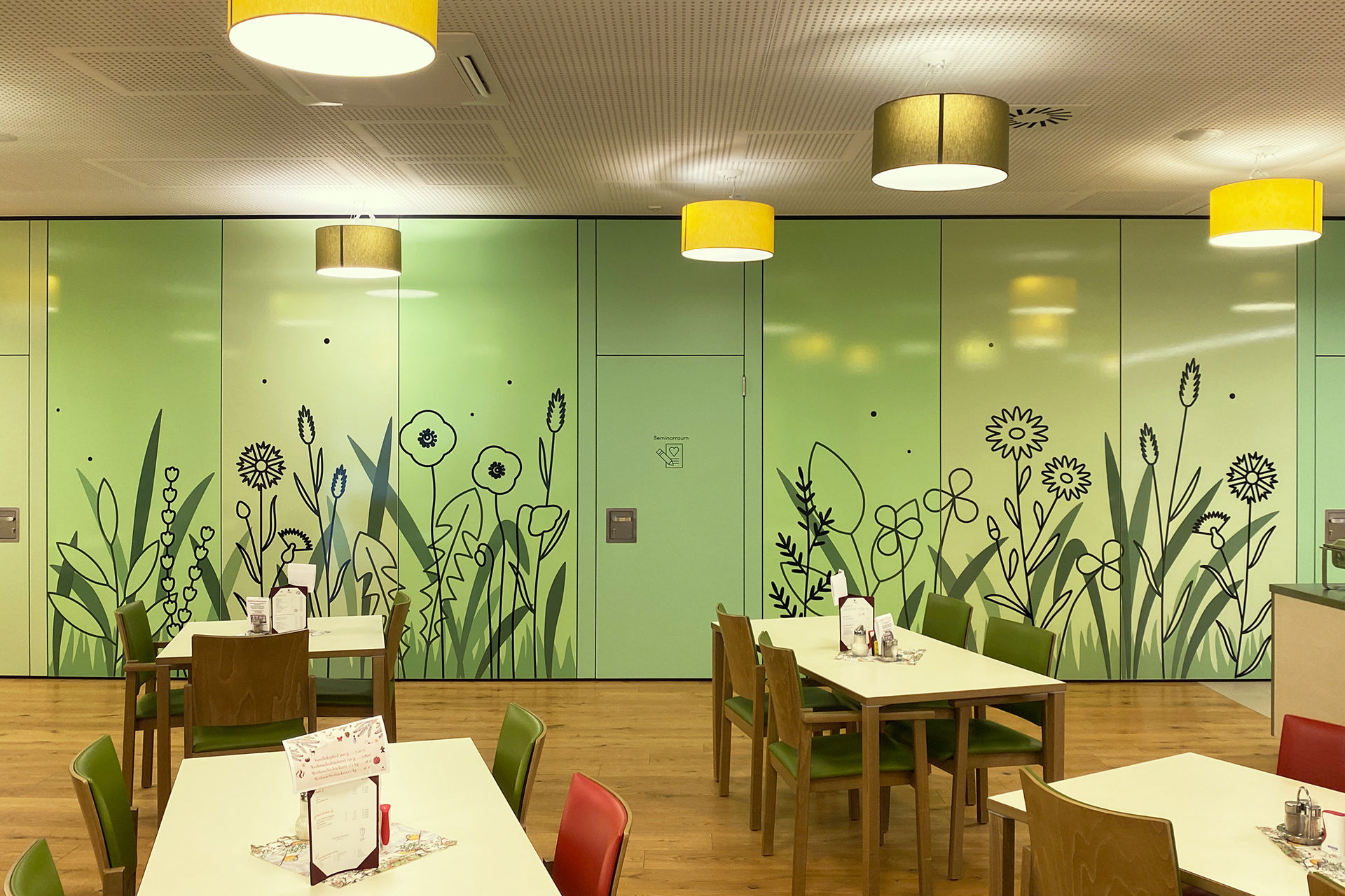 Im Pflegeheim Haus der Barmherzigkeit in Wiener Neustadt gestaltete ich die Wand der Cafeteria mit einer lebendigen Darstellung einer Blumenwiese. Die Illustration zeigt heimische Blumenarten und schafft eine positive Atmosphäre, die das Wohlbefinden und die Aufenthaltsqualität in diesem Bereich steigert.