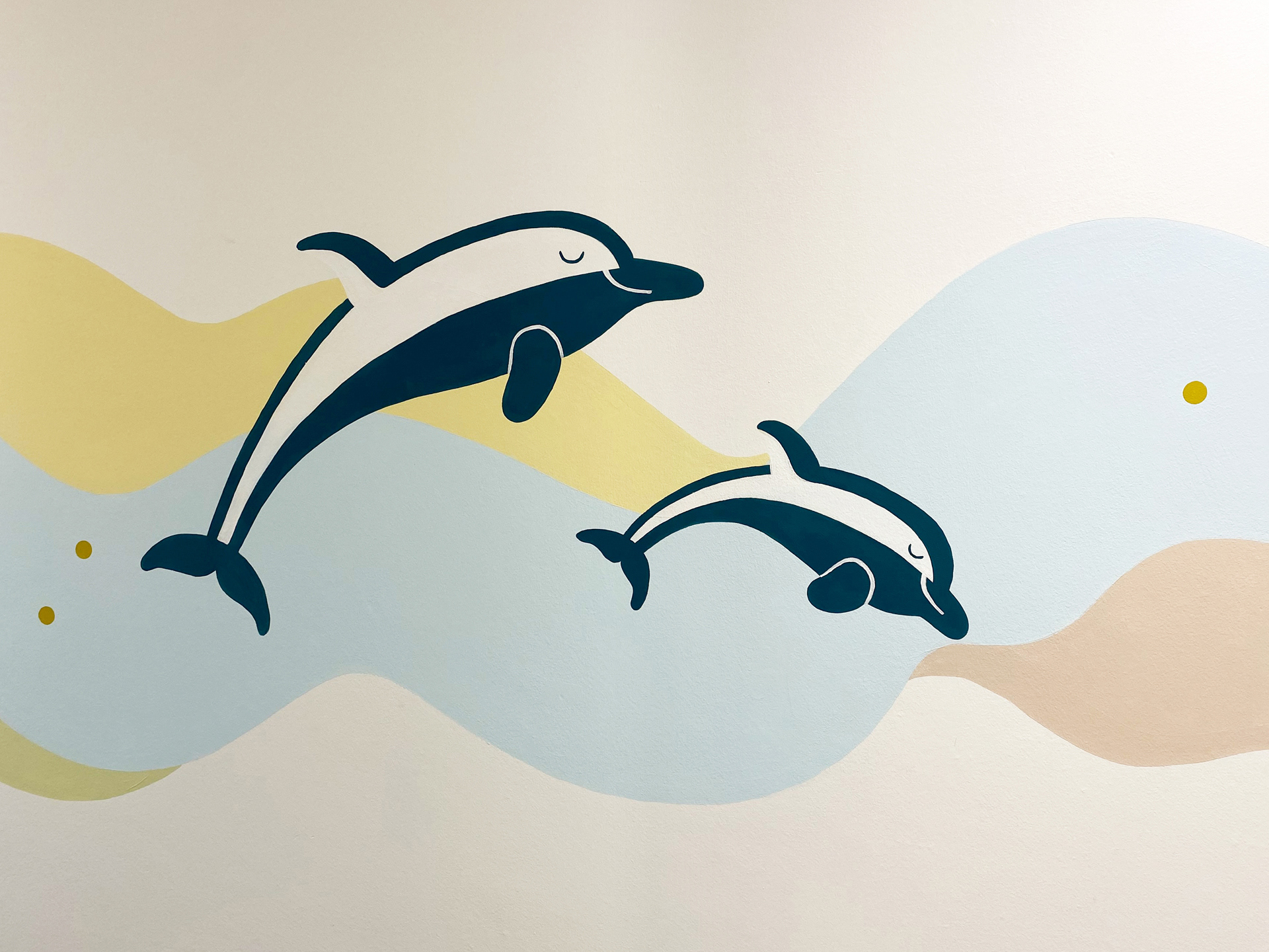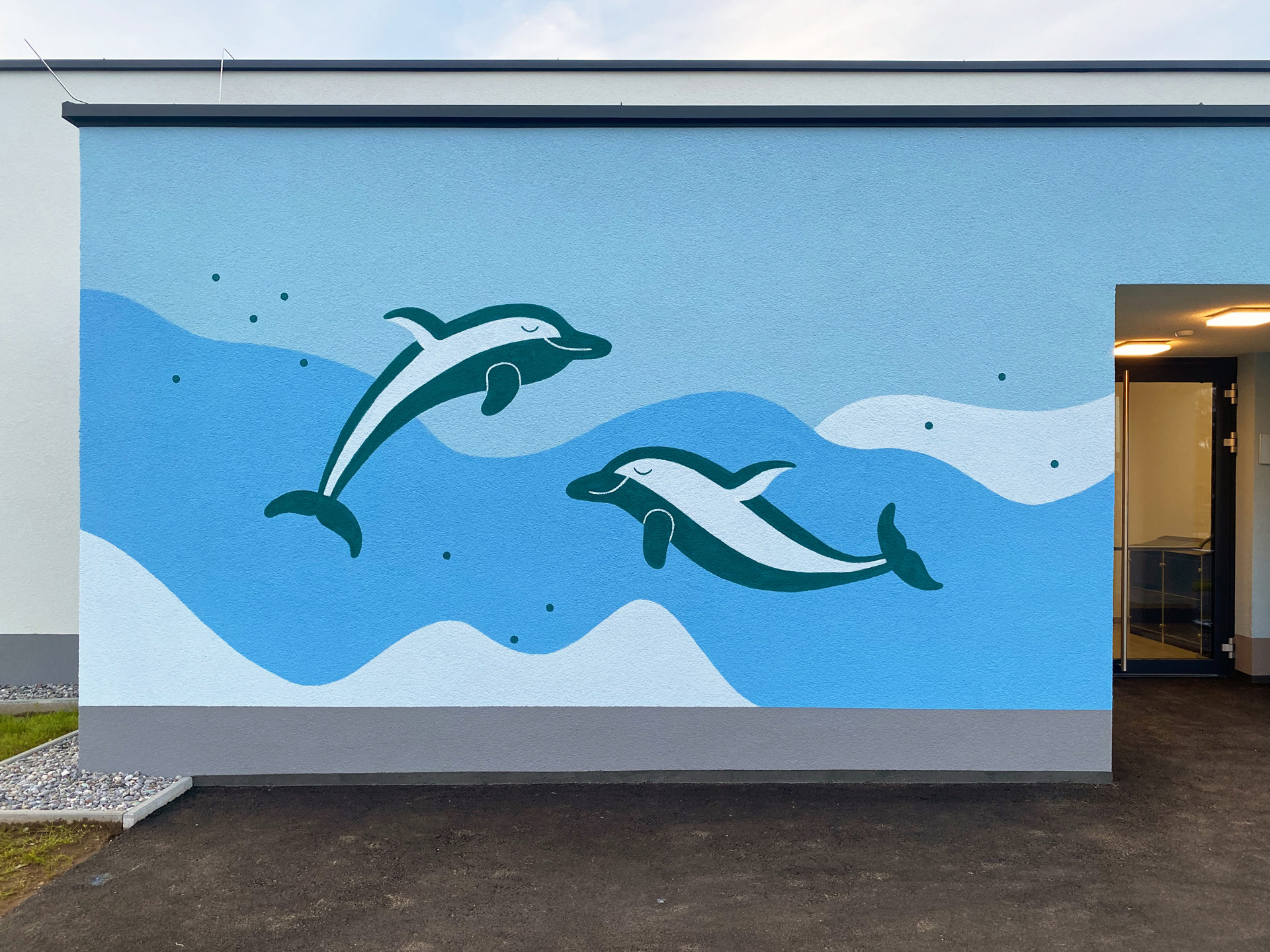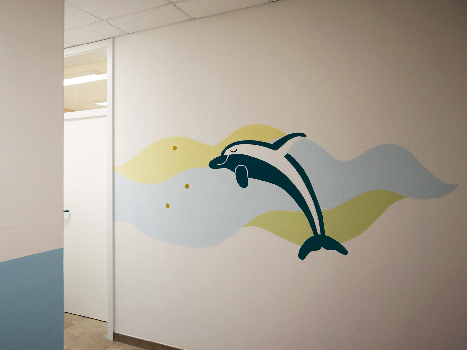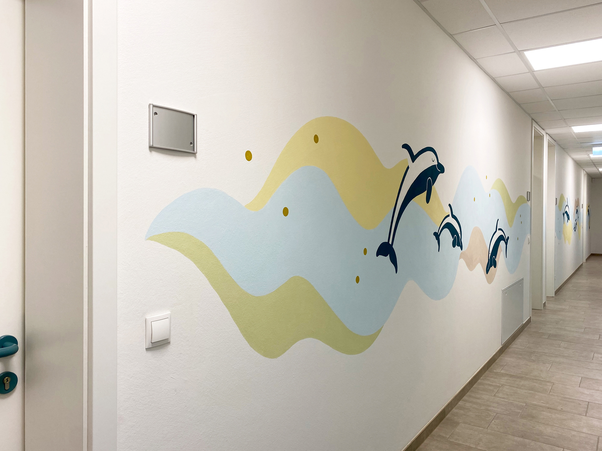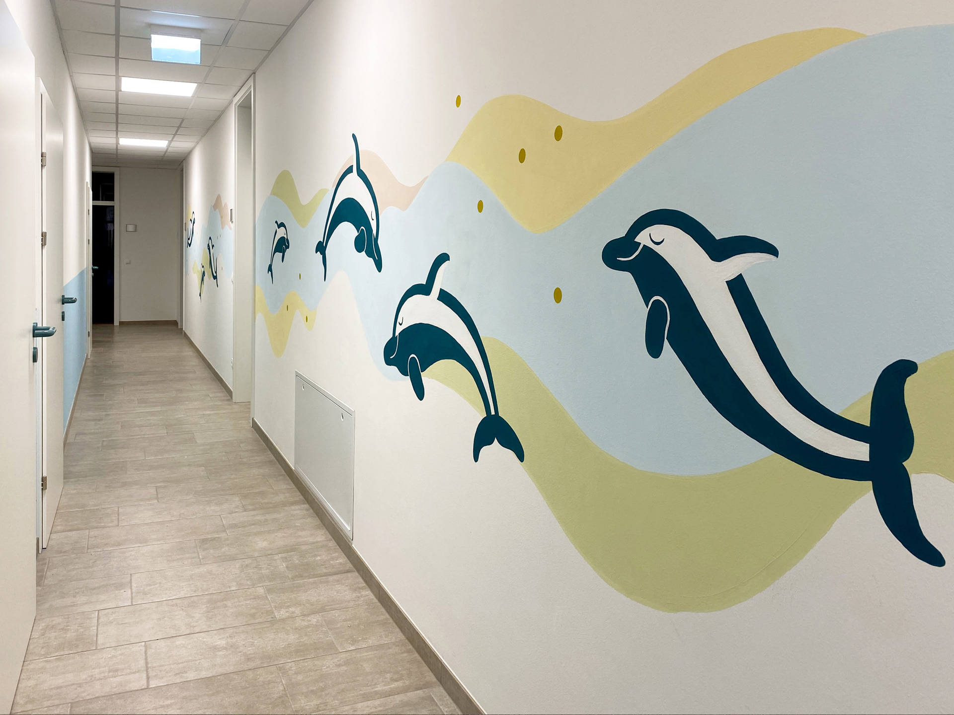 Die Kinderschutzzentren bieteten ein ambulantes Beratung-, Kriseninterventions- und Therapieangebot für Familien mit Kindern und Jugendlichen, die von Gewalt betroffen oder gefährdet sind. Die Wandbilder in den Fluren der Kinderschutzzentren zeigen freundliche Delfine in sanften Farbtönen. Ihre Gestaltung schafft eine beruhigende Atmosphäre, die Sicherheit und Geborgenheit vermittelt. Die Motive greifen das Logo auf und sorgen so für ein stimmiges, wiedererkennbares Gesamtbild, das die Kinder willkommen heißt.
