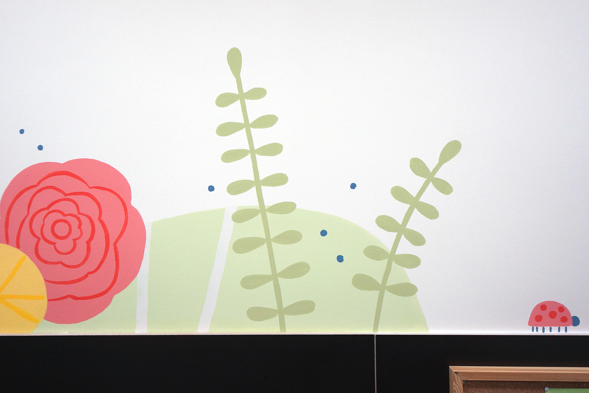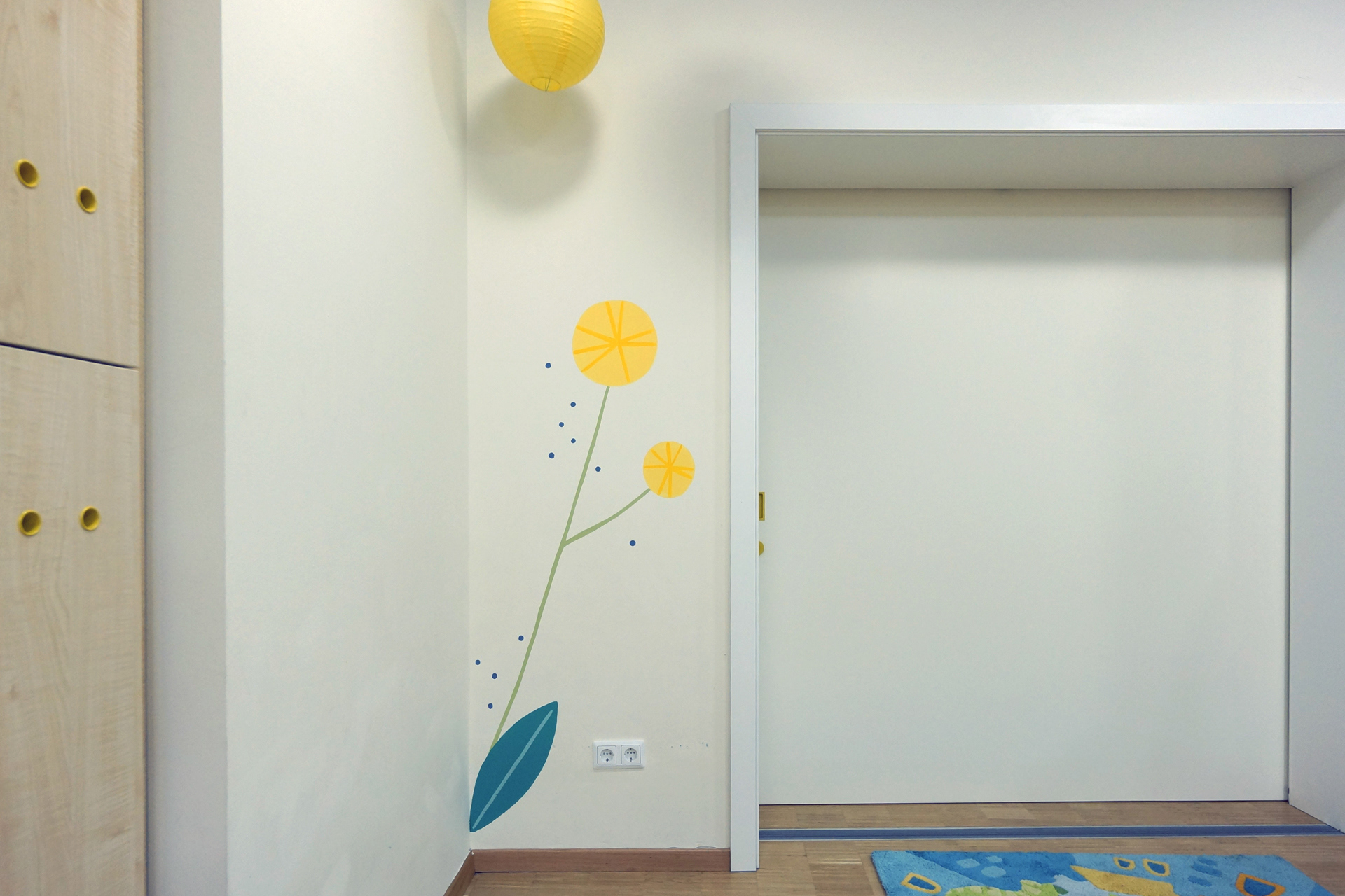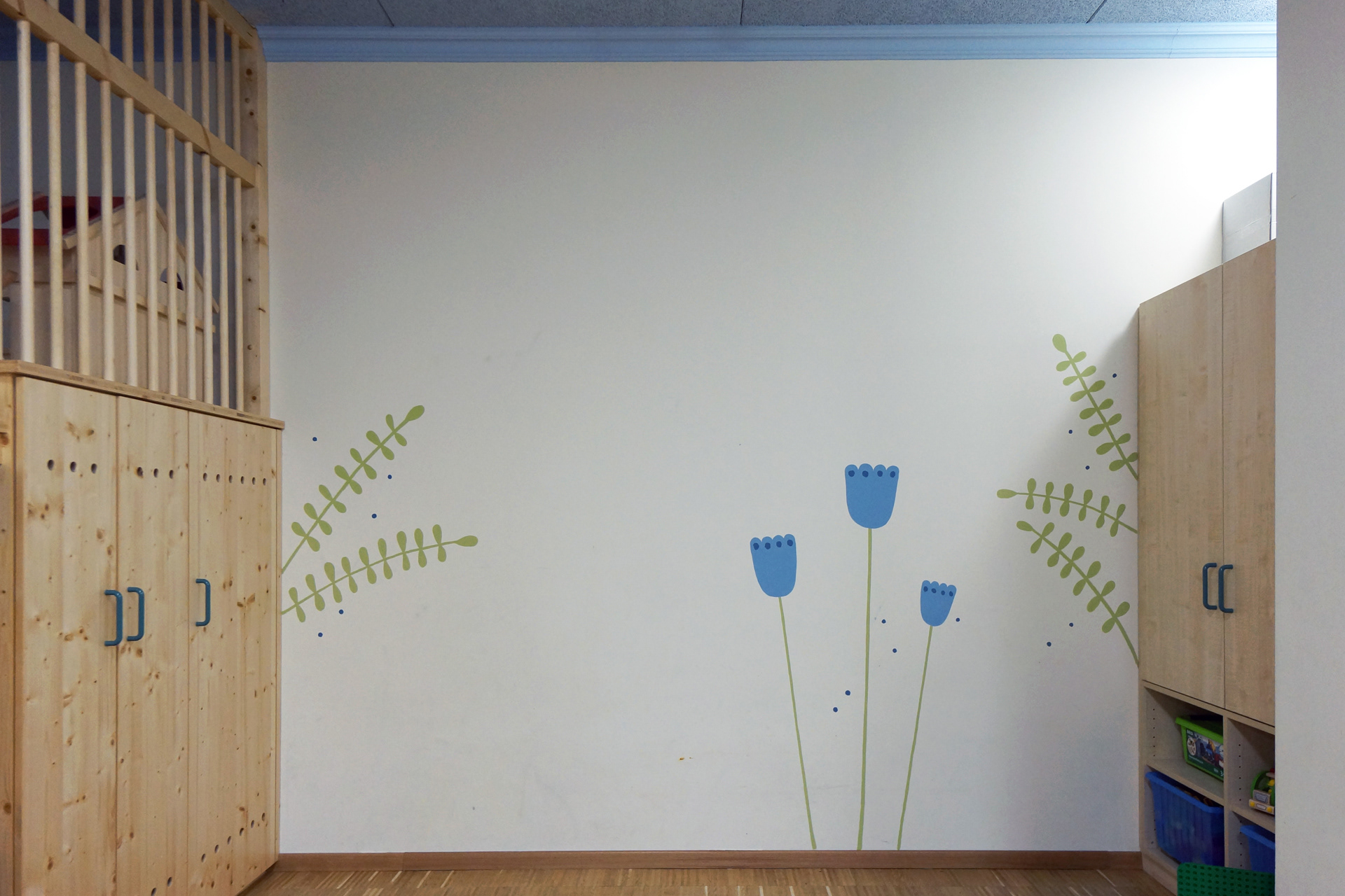 Die Wandbilder im Kindergarten greifen den Namen der Einrichtung auf und zeigen liebevoll gestaltete florale Motive, in den Farben der verschiedenen Kindergartengruppen. Zwischen Blumen, Blättern und Pflanzen entdecken die Kinder kleine Tiere, die sich spielerisch in den Szenen verstecken und zum Erkunden einladen.