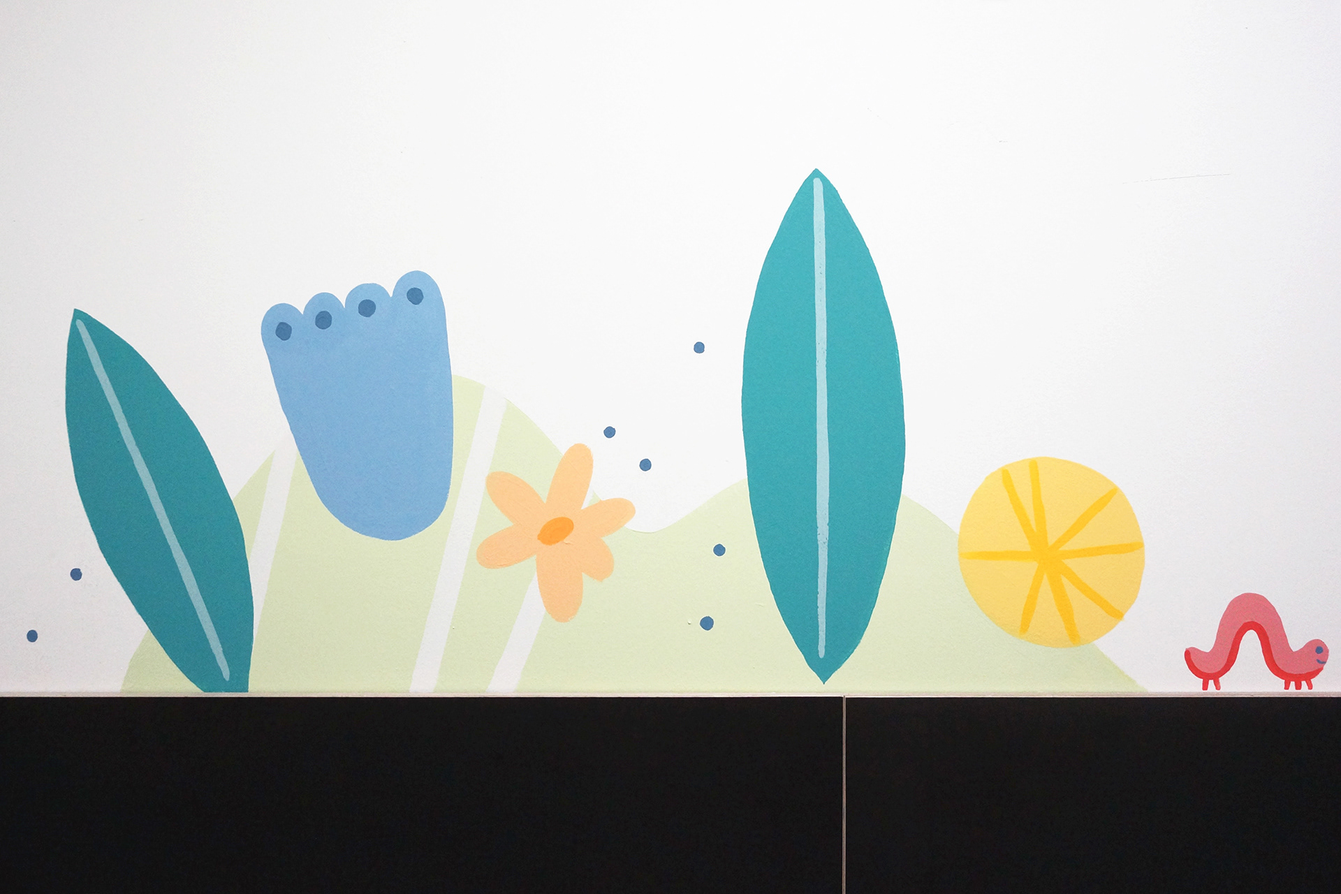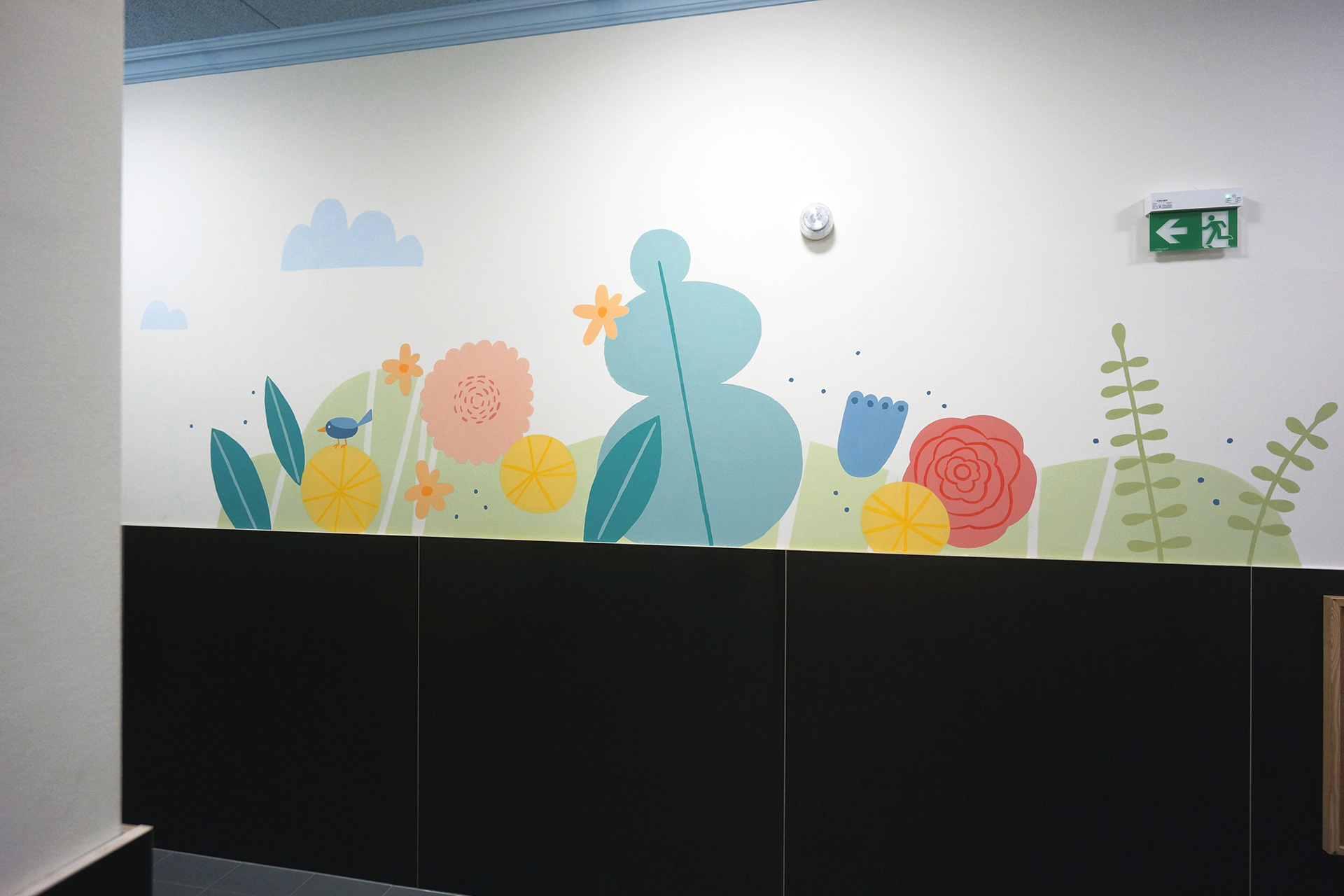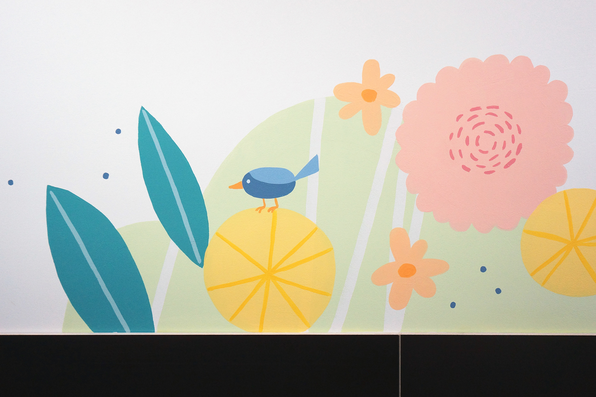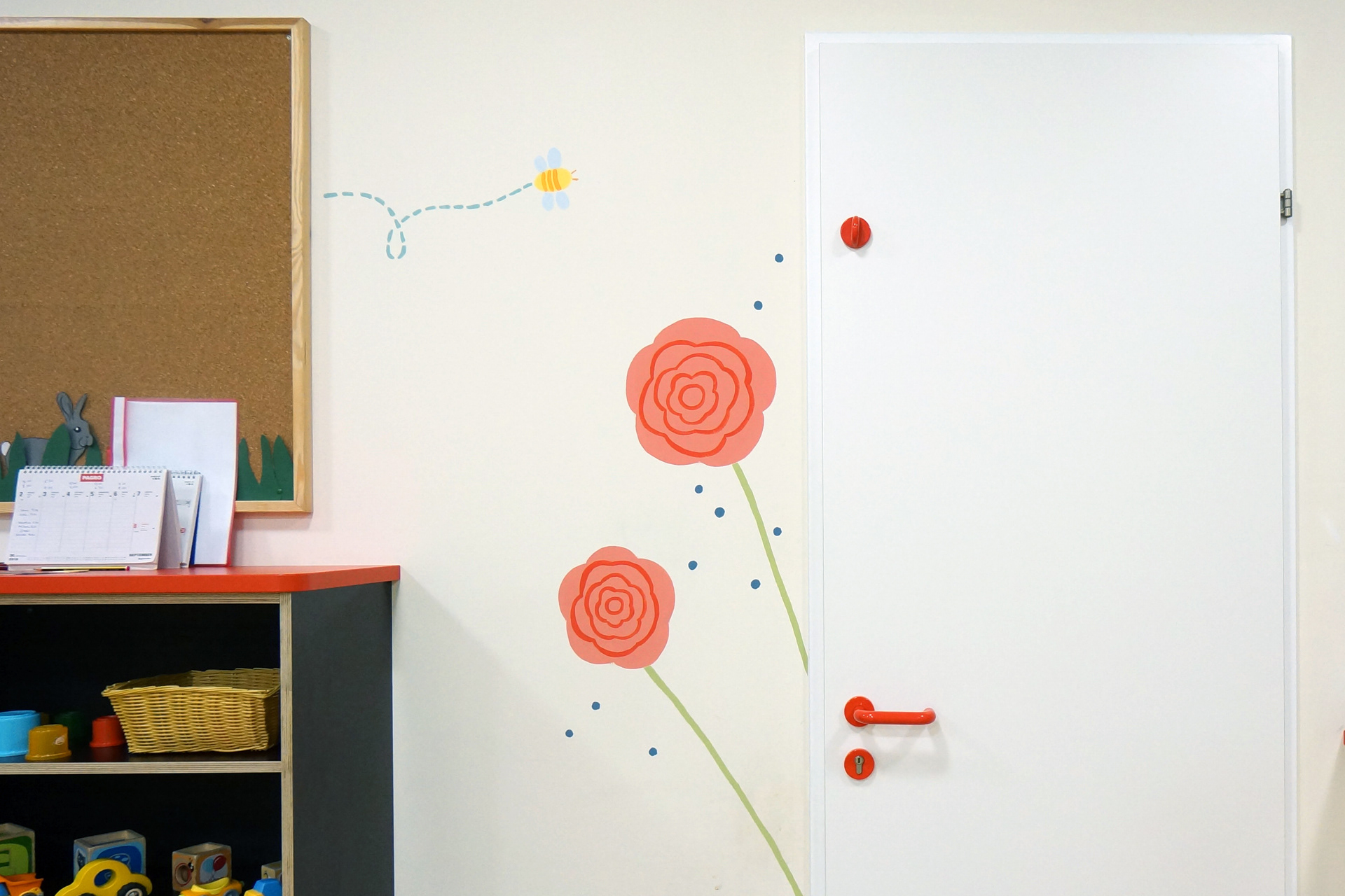 Die Wandbilder im Kindergarten greifen den Namen der Einrichtung auf und zeigen liebevoll gestaltete florale Motive, in den Farben der verschiedenen Kindergartengruppen. Zwischen Blumen, Blättern und Pflanzen entdecken die Kinder kleine Tiere, die sich spielerisch in den Szenen verstecken und zum Erkunden einladen.