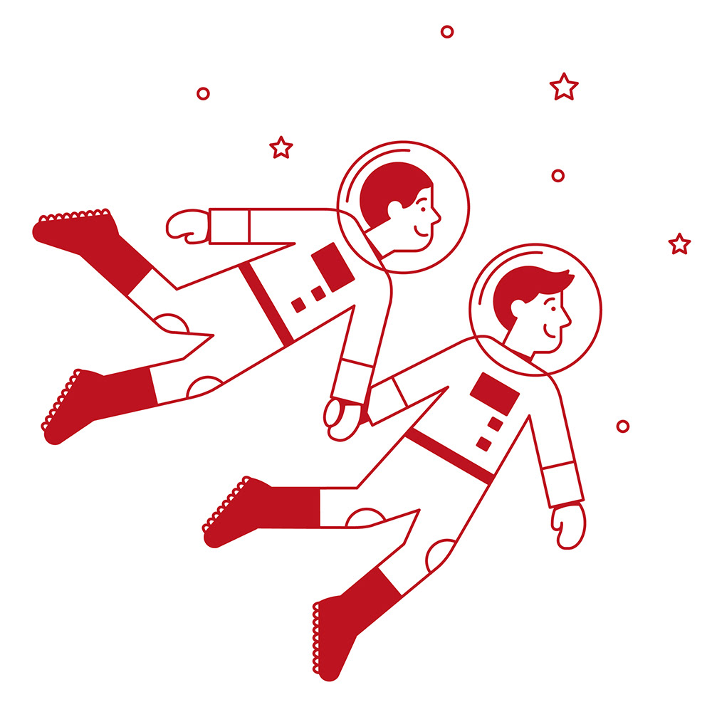 Ob auf einem Tandem, im Weltraum oder bei einem gemeinsamen Cocktail – die Illustrationen zeigen besondere Momente der Verbundenheit.